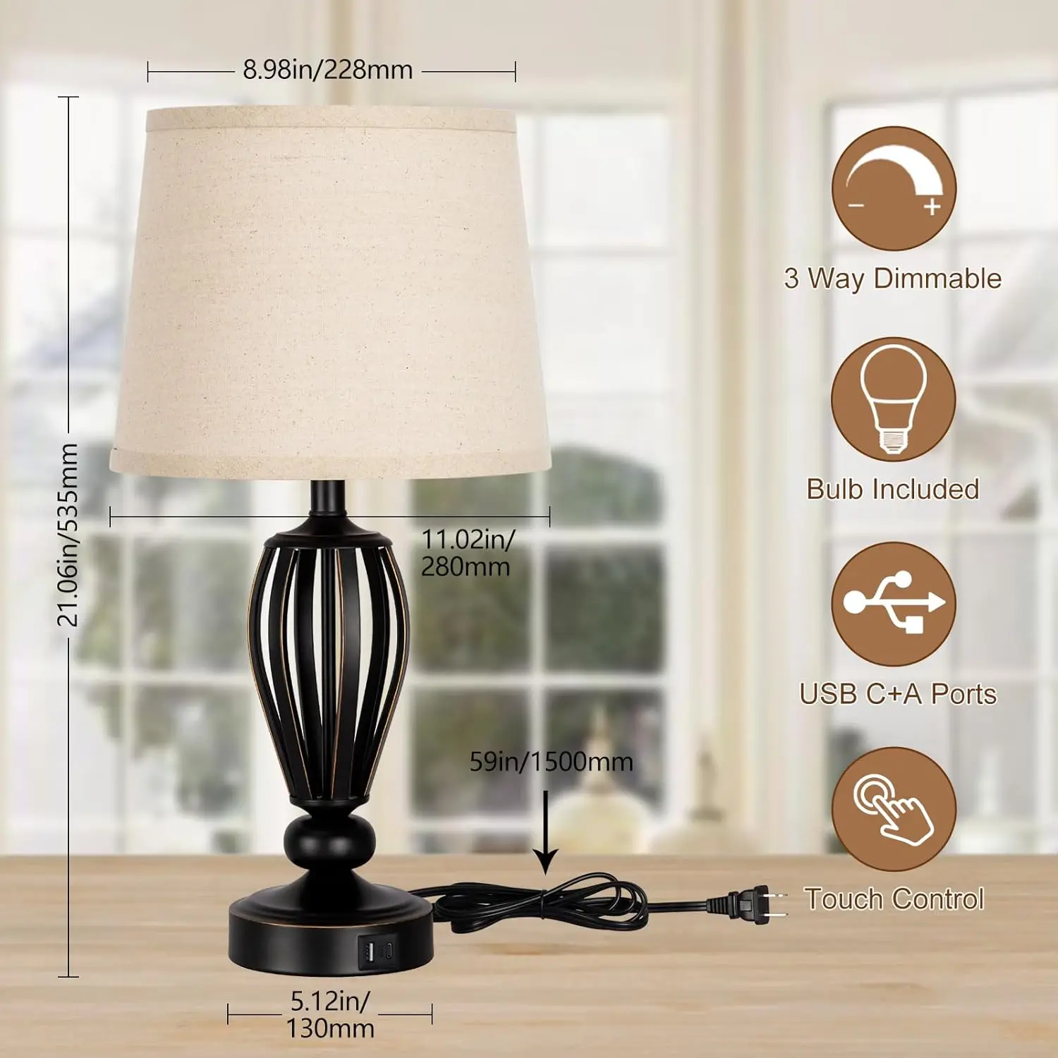 3-Way Dimmable Touch Table Lamp with USB C+A Charging Ports Industrial Table Lamp Black Metal Base Farmhouse Reading Lamp for Bedroom, Living Room, Office or Study LED Bulb Included