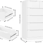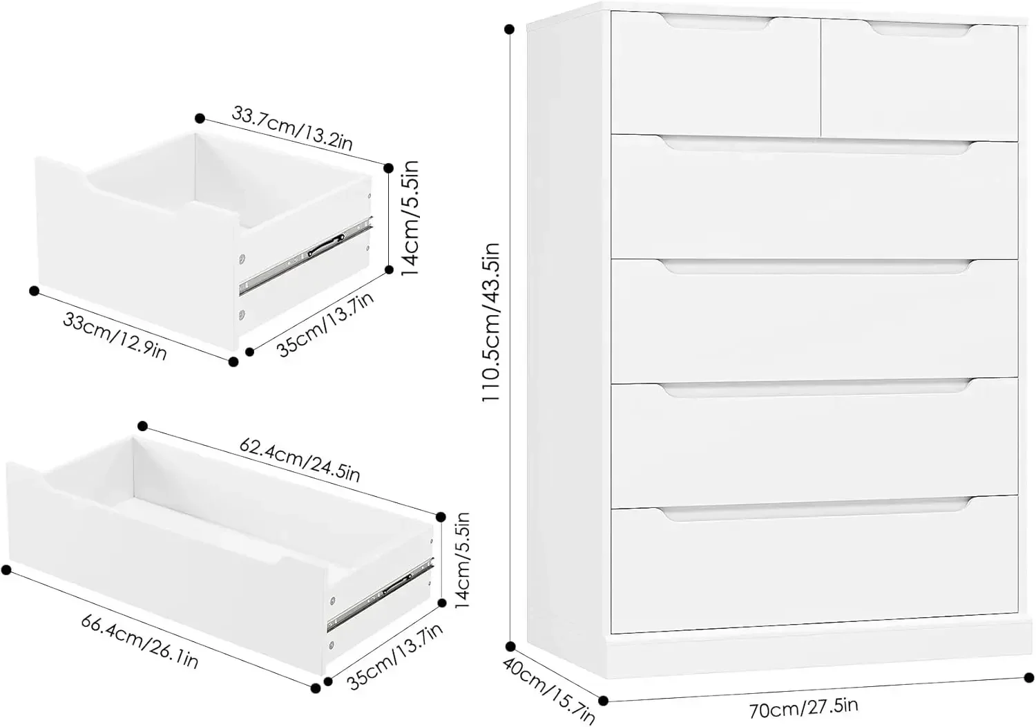 • STURDY STRUCTURE: Consisting of premium MDF wood and quality hardware, this tall 6 drawer dresser features superior sturdiness and long lasting durability. Each lower drawer holds up to 25 lbs. Overall measurements: 15.7”D x 27.6”W x 43.5”H