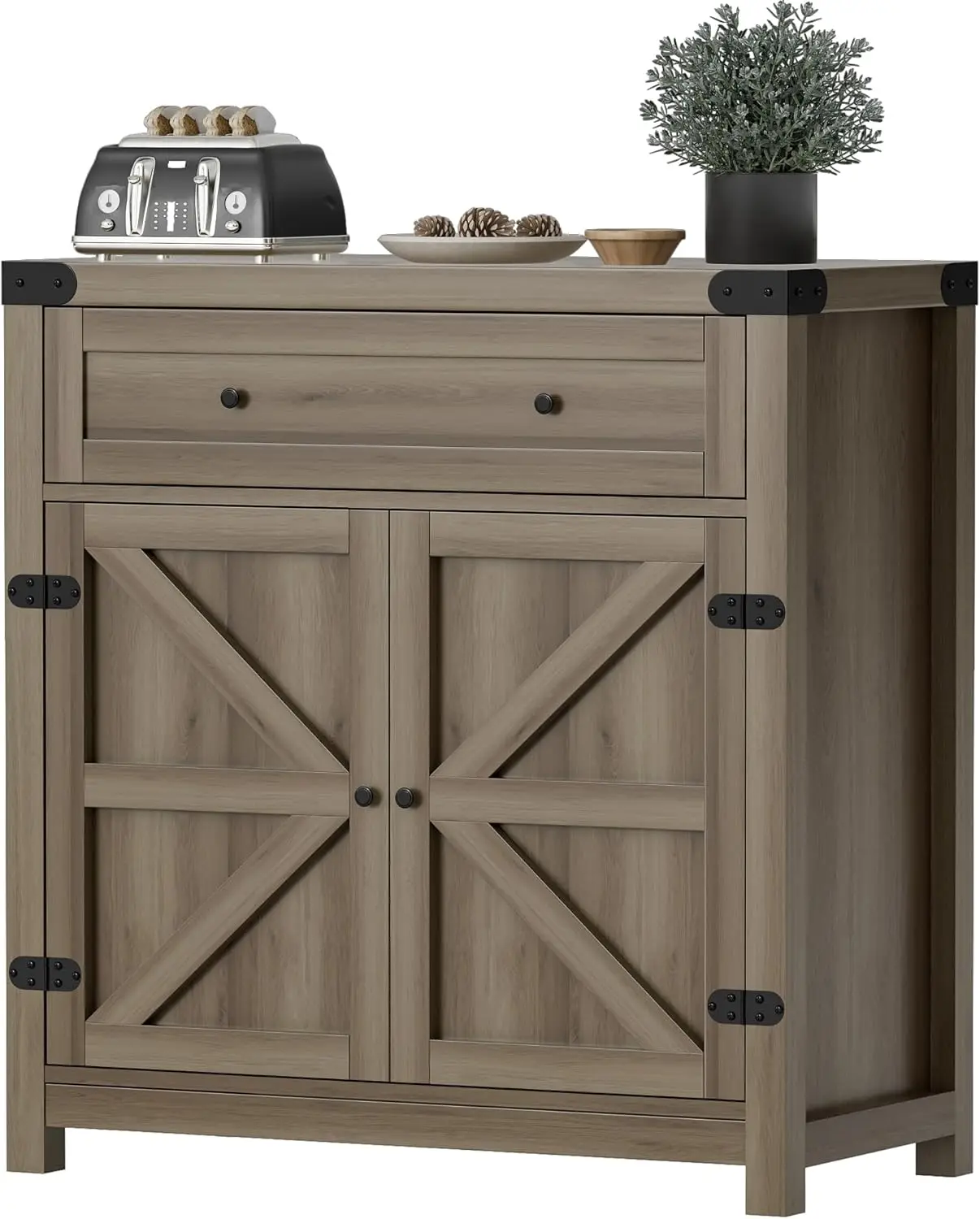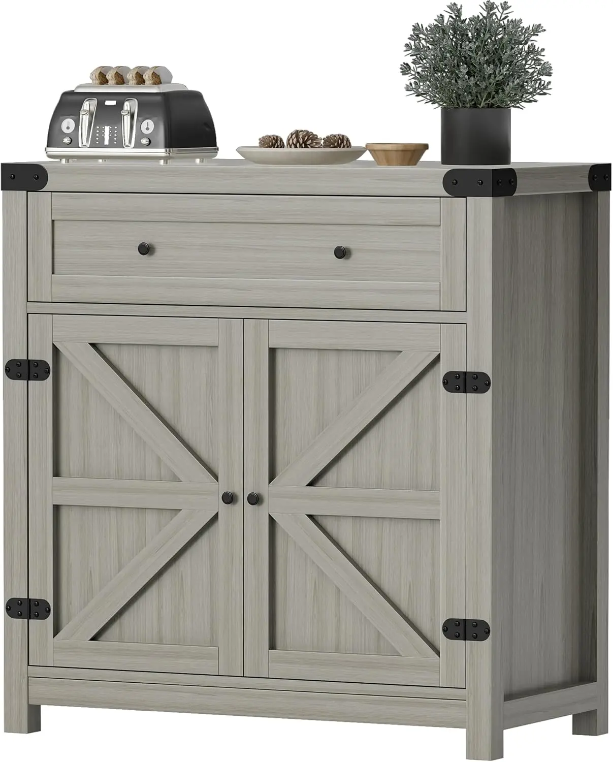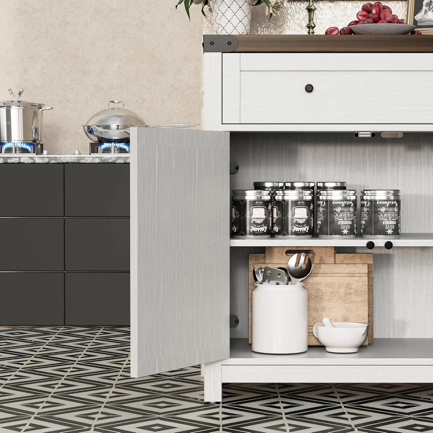 The kitchen storage cabinet has a large drawer and two-door cabinet with an adjustable shelf to meet your storage needs for coffee beans, condiments and some miscellaneous items, while the wide tabletop can hold a microwave and coffee maker.