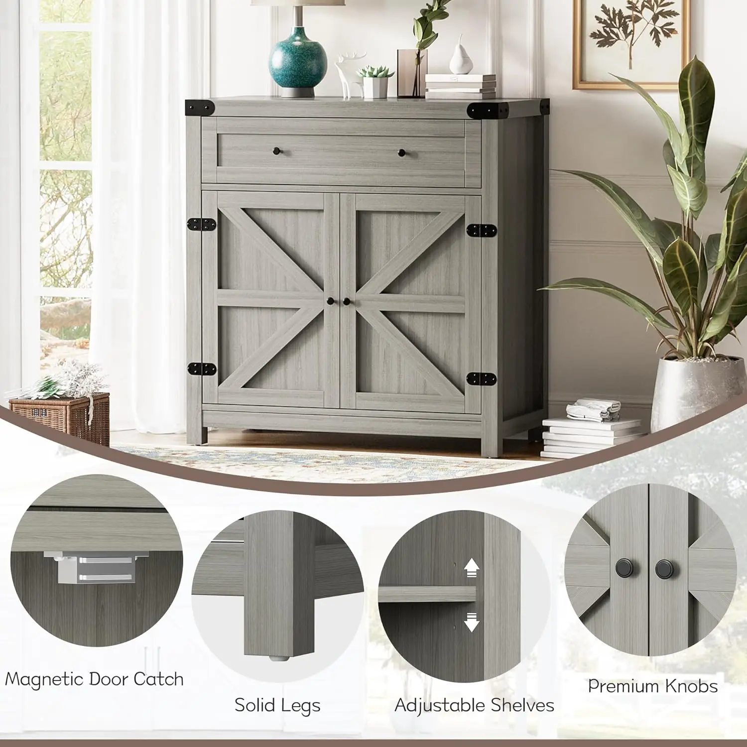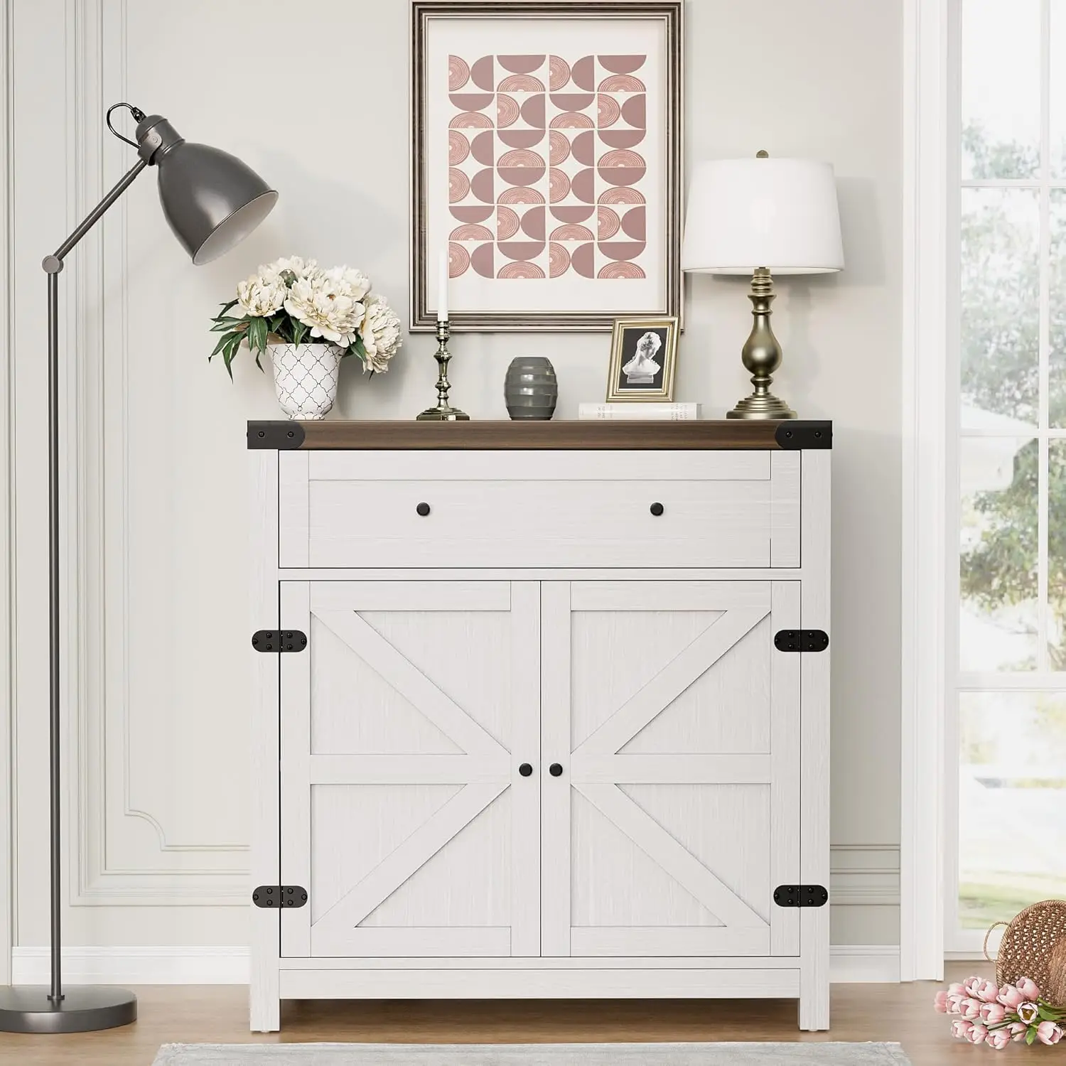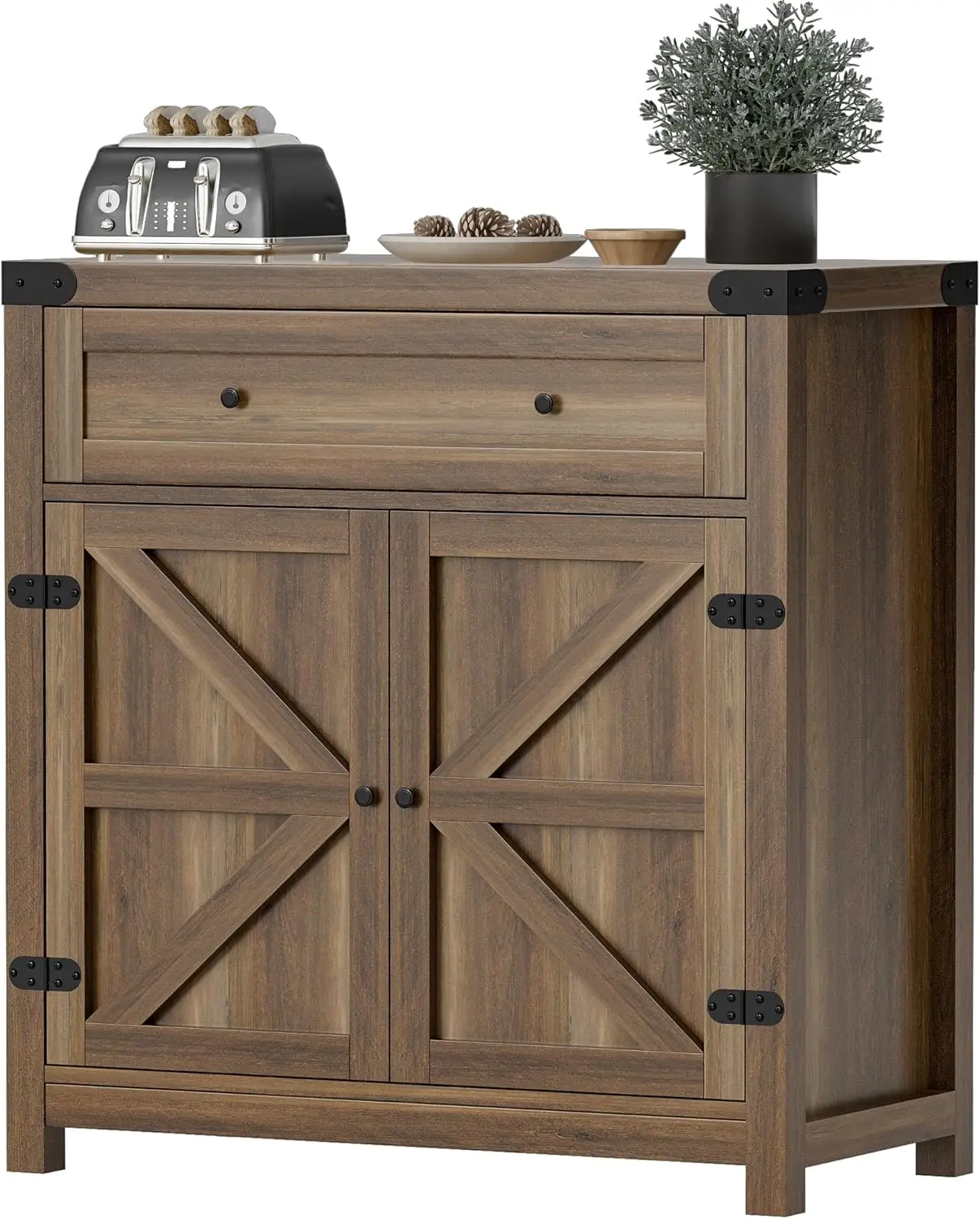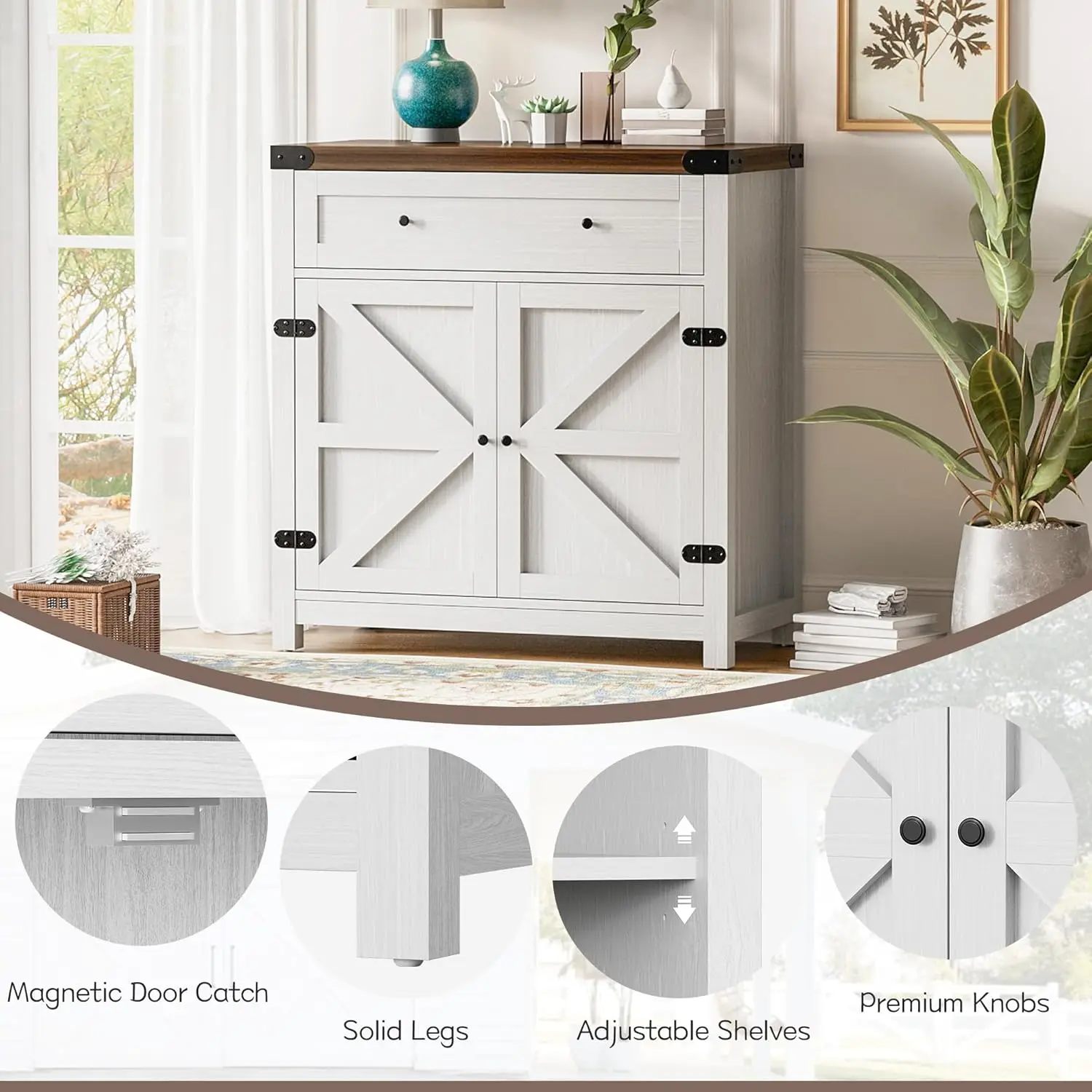 The kitchen storage cabinet has a large drawer and two-door cabinet with an adjustable shelf to meet your storage needs for coffee beans, condiments and some miscellaneous items, while the wide tabletop can hold a microwave and coffee maker.