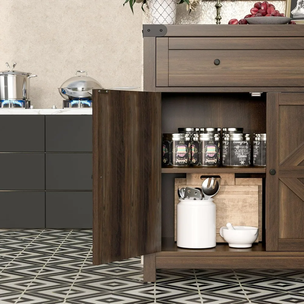 The kitchen storage cabinet has a large drawer and two-door cabinet with an adjustable shelf to meet your storage needs for coffee beans, condiments and some miscellaneous items, while the wide tabletop can hold a microwave and coffee maker.
