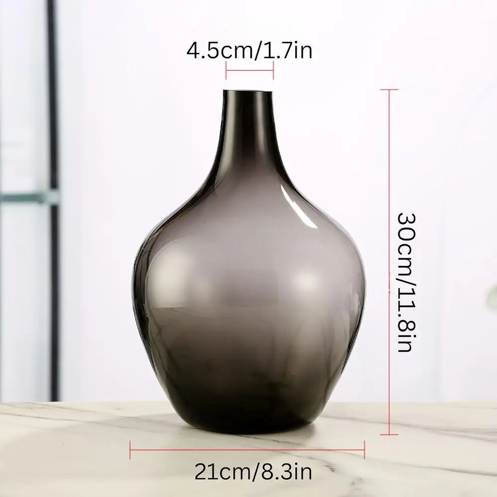 Introducing our elegant gray glass vase, designed with a distinctive demijohn balloon shape that enhances any home decor. This vase’s classic design and rich smoked gray hue add a contemporary, refined touch to your space, making it suitable for both tabletop and floor arrangements. Crafted from 100% premium glass, this black glass vase stands at 12 inches tall and has a width of 8.2 inches.