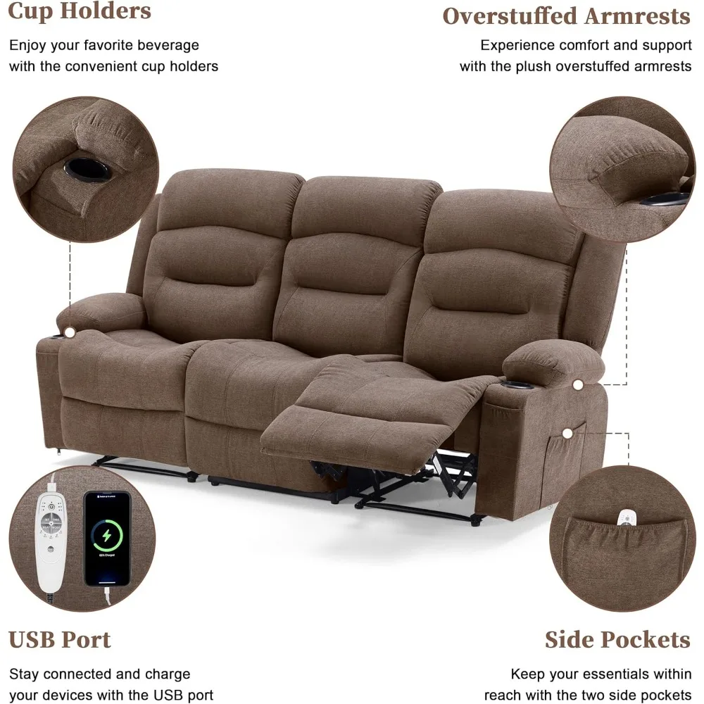 - CONVENIENT DESIGN: The sofa reclinable comes with a USB port for easy device charging while seated or reclining. It also features two side pockets, front pockets, and cup holders. (Please note: The USB port is exclusively for low-power devices)