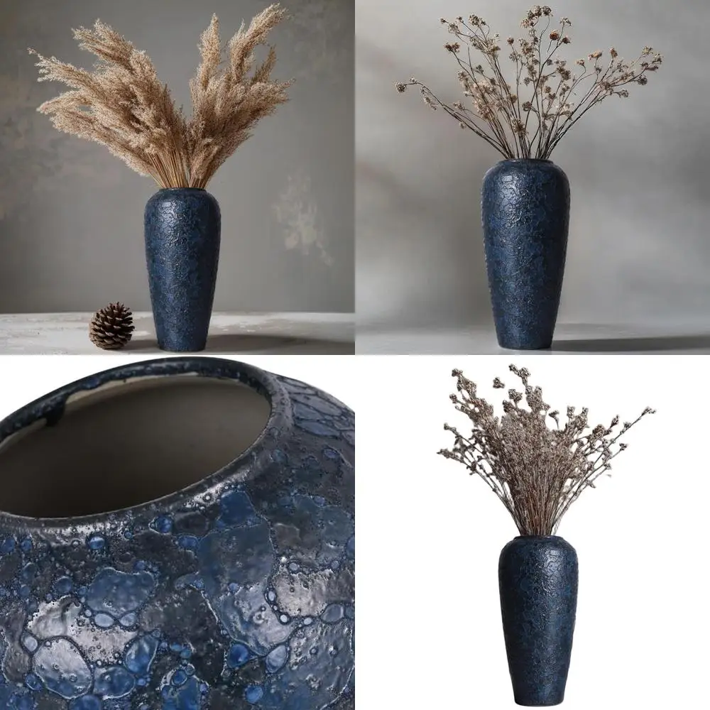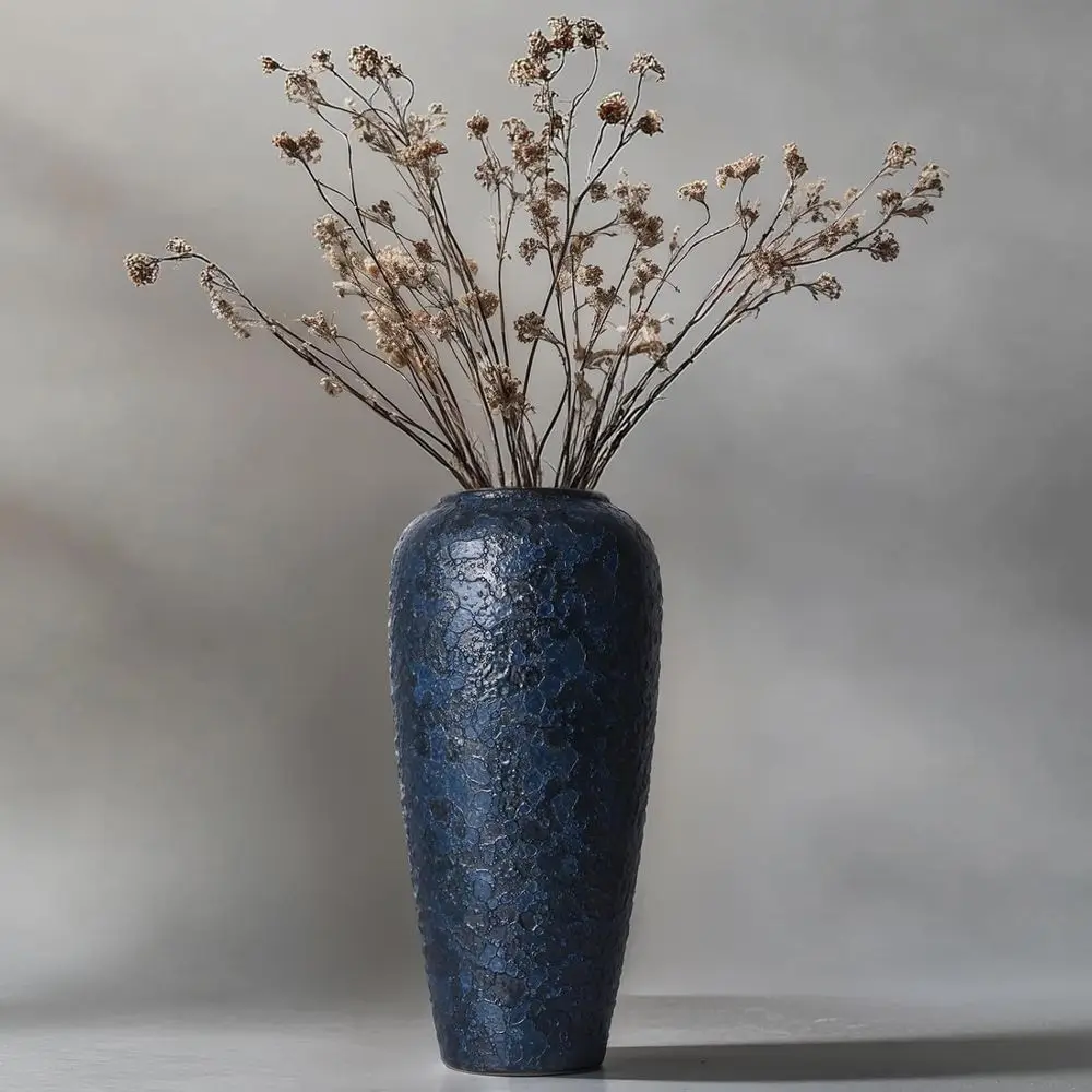 This premium blue ceramic vase features an elegant design crafted from high-quality materials. Its rich blue hue and distinctive textured surface make it a striking addition to any space. Ideal for placement in living rooms, offices, or bedrooms, this vase adds a modern and rustic flair to your decor.