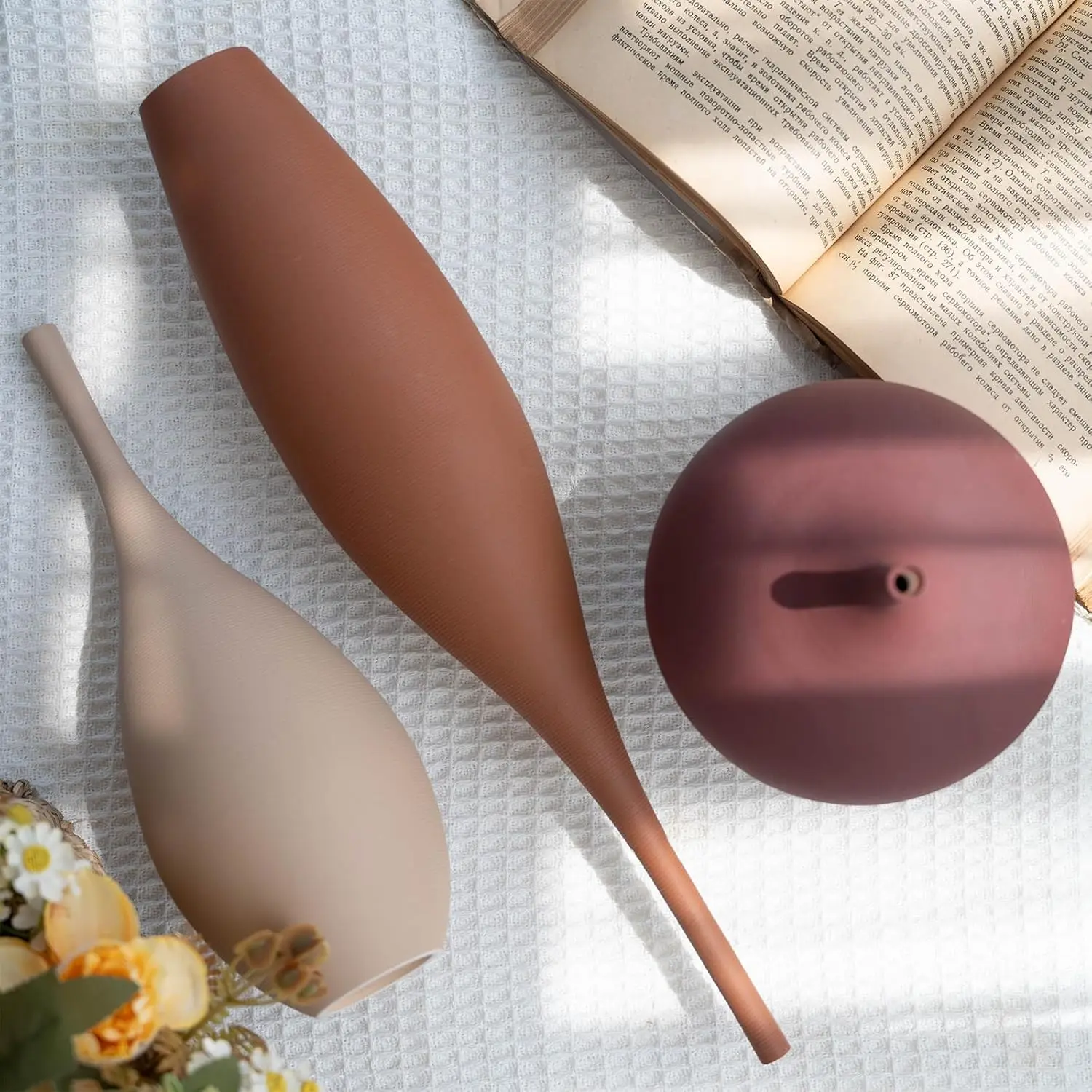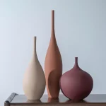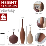 Enhance your home decor with this elegant set of three modern ceramic vases, designed to bring a minimalist farmhouse aesthetic to any space. Perfect for centerpieces, these matte ribbed vases add a touch of sophistication and warmth to your living room, entryway, or table settings. Key Features: – **Stylish Design**: Each vase features a sleek matte finish with subtle ribbed texture, creating a contemporary yet rustic look that complements various interior styles. – **Versatile Use**: Ideal as decorative pieces for centerpieces on dining tables, mantels, or shelves; they can also hold dried flowers or artificial arrangements for long-lasting beauty. – **Durable Material**: Made from high-quality ceramic that is sturdy and resistant to wear, ensuring they remain beautiful over time without chipping easily. – **Color Variety**: The set includes three distinct colors – brown, khaki, and dark red – allowing you to mix and match or coordinate with your existing decor palette. – **Easy Maintenance**: Simple to clean with a damp cloth; no special care required, making them practical for everyday use in busy households. Benefits: – Elevate your home’s ambiance by adding these aesthetic vases that blend seamlessly into farmhouse-inspired or minimalist decors. – Create focal points in rooms like the living room or entryway to impress guests and enhance visual appeal. – Save space with the compact set design while offering multiple decorative options through different color combinations. Ideal For: Homeowners looking to refresh their interior spaces with trendy yet timeless decor items. Whether you’re decorating a new home or updating an existing one, these vases provide an affordable way to achieve a polished look. They make excellent gifts for housewarmings or special occasions due to their universal appeal and functional design.