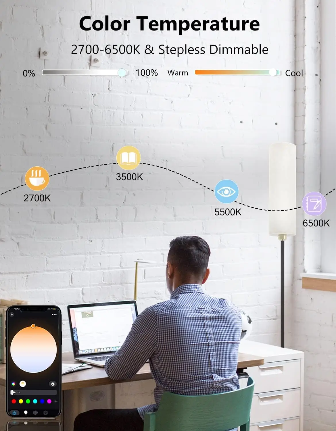 【Stepless Dimmable】Smart LED Bulb is 800 lumens, 2700K-6500K color temperature can be adjusted smoothly. Bright floor lamp have 0-100% adjustment bar. Stepless switch between warm and cold light.