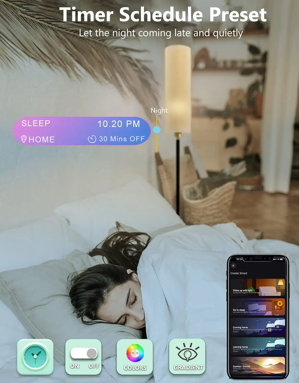 【Color Changing】Smart WiFi RGB floor lamp provide millions of light colors. It can sync music and preset scenes, eventhough the timer preset to light up the lamp with customized colors. With smart LED bulbs, you can change the lighting atmosphere of the room at will!