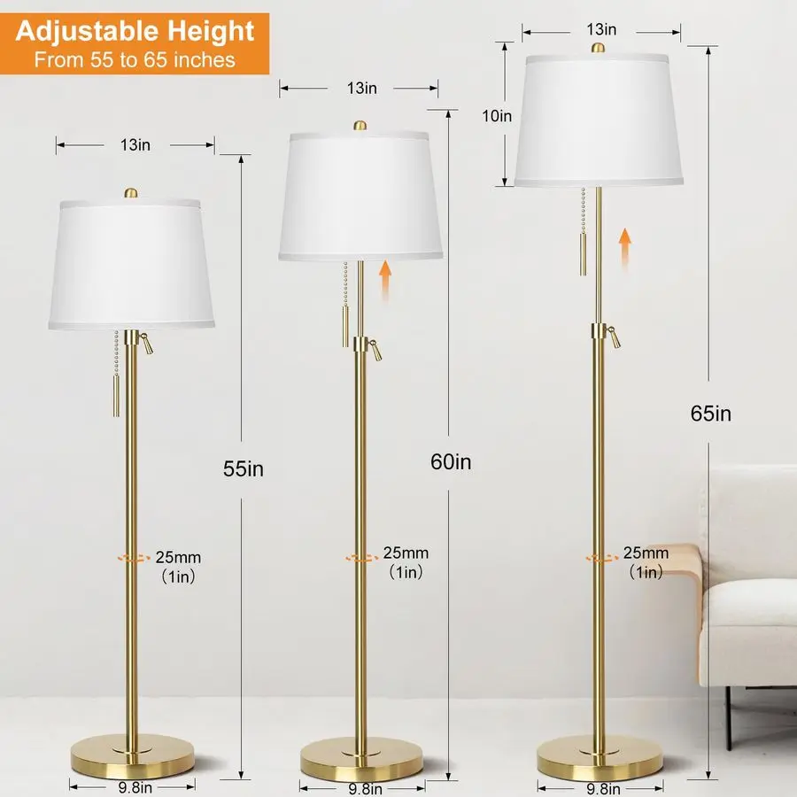 Adjustable Height Modern Floor Lamp This tall standing lamp can be adjusted between 5565 to adapt to the best lighting in any situation, meeting the needs of different age groups, such as children, adults and the elderly. With the most flexible adjustable height pole, this gold floor lamps illuminate a larger area of your space, whether at home or in the office, perfect for lighting in different scenarios
